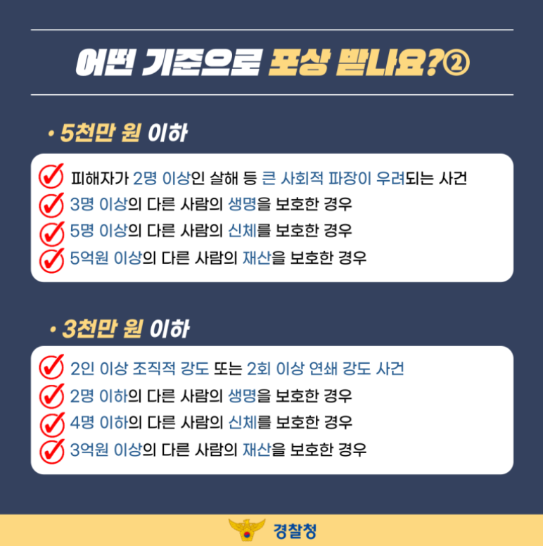 이처럼 포상금은 단순한 보상이 아니라, 공공 안전에 기여한 공로를 공식적으로 인정하는 과정의 일부입니다.