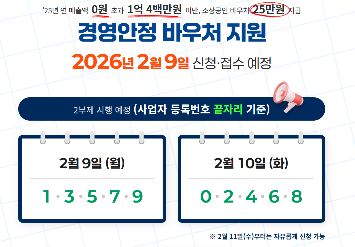 신청일인 2월 9일, 2월 10일일에는 사업자등록번호 끝자리 기준 2부제가 적용되며, 이후에는 자유 신청이 가능합니다.